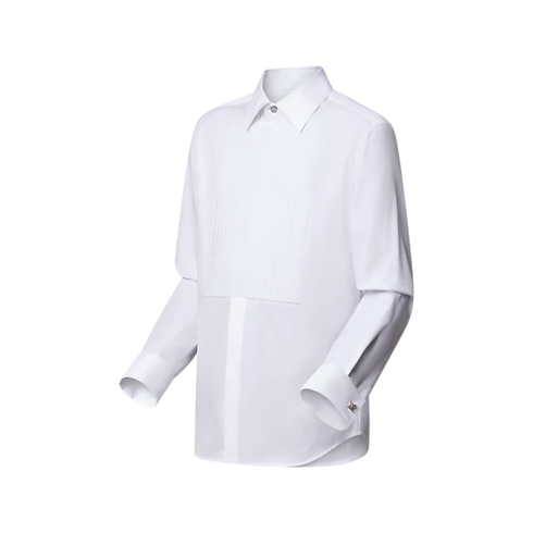 Très élégante, cette chemise de soirée blanche en popeline de coton se distingue par un plastron plissé, des boutons de manchette LV en métal et un bouton de col LV sur la patte de boutonnage dissimulée. Ce modèle sophistiqué peut se porter sous un gilet de costume ou avec un smoking pour compléter une tenue de soirée intemporelle.