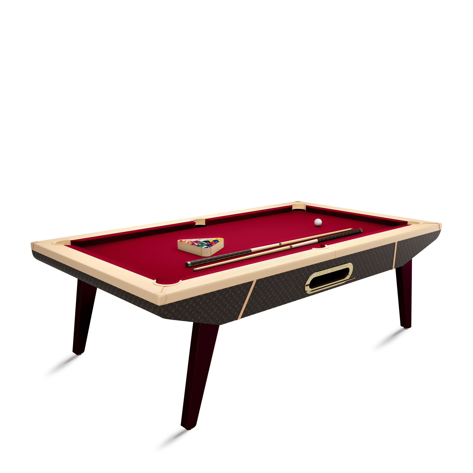 Élégante, cette table de billard GM en toile rend hommage à l'attrait perpétuel de la Maison pour le sport et les voyages. Recouverte de toile Monogram Éclipse, cette table en bois d'exception est embellie de finitions métalliques argentées. La tradition malletière de la Maison se reflète dans les coins en cuir cousus, tandis que le savoir-faire méticuleux de Louis Vuitton transparaît dans les clous gravés et la fleur de Monogram apposée sur chaque boule.