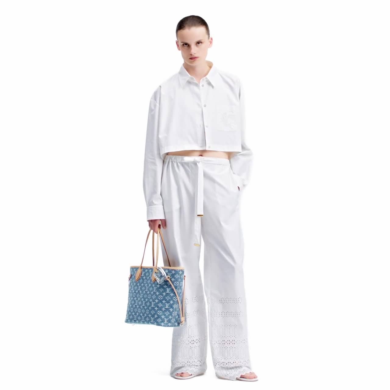 Cette chemise doit son allure romantique et estivale à ses détails de la saison. Confectionnée en popeline de coton légère et respirante, elle reprend les codes classiques du tailoring avec un col élégant et des poignets boutonnés. Sa coupe courte lui apporte un accent actuel tandis que la poche plaquée est subtilement signée de LV Initiales en broderie anglaise. Des boutons en nacre complètent le modèle.
