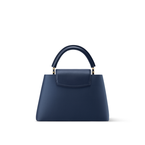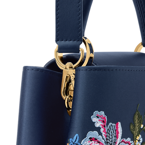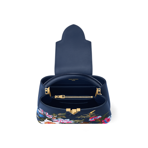 Cet élégant sac Capucines BB se distingue par son vif imprimé inspiré de la faune et la flore, subtilement contrasté sur un fond bleu marine. Confectionné en cuir de veau et rehaussé d’une poignée et d’une bandoulière en cuir de vache, il offre de multiples possibilités de porté. Cette pièce à rabat modulable s'agrémente des emblématiques LV Initiales, ainsi que d’un intérieur compartimenté doté d'une poche plate. Son format idéal permet d’accueillir tous les indispensables du quotidien, tels qu’un téléphone, un portefeuille et quelques produits de maquillage essentiels.