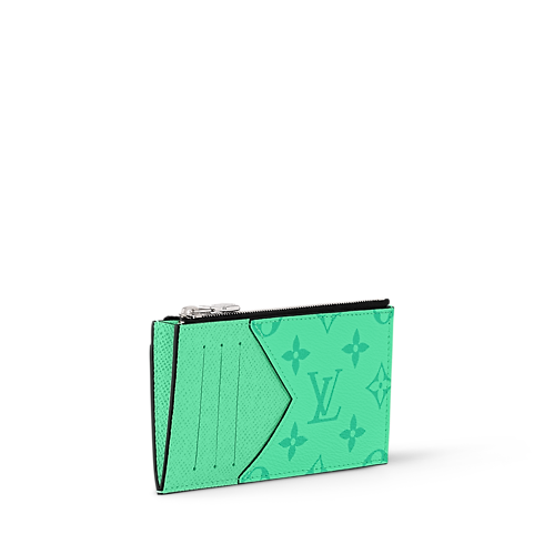 Ce porte-monnaie et porte-cartes allie la toile Monogram colorée à du cuir de vache Taïgarama assorti. Une élégante fente en forme de V marque la transition entre la toile et le cuir. L'intérieur se dote de quatre fentes pour les cartes, d'une poche zippée pour la monnaie et d'un compartiment plat pour les billets ou reçus.