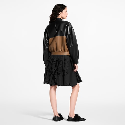 Ce bomber classique revisité en cuir offre un look moderne et sophistiqué. L'élégance du cuir d'agneau noir est contrastée par la partie inférieure color-block qui apporte une touche graphique. Un fermoir pivotant ajoute une note métallique emblématique au col montant, tandis qu'une doublure Monogram matelassée signe l'intérieur. Ce modèle est également doté de deux poches latérales.