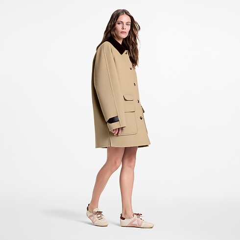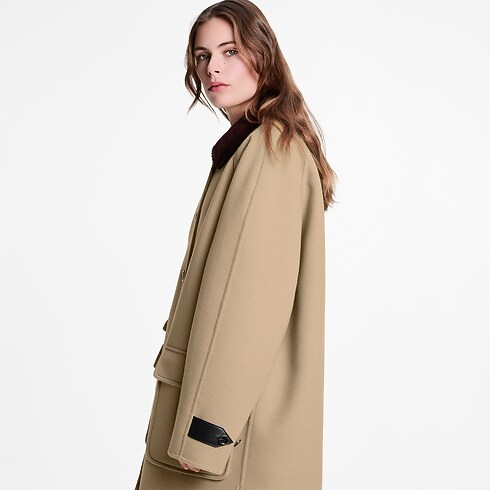 Ce manteau intemporel présente une coupe droite, confectionnée dans un somptueux mélange double-face de laine, coton et soie. Trois poches à rabat soulignent la structure, tandis qu’un col contrasté en velours côtelé et des boutons en corne lui insufflent une allure masculine. Les poignets sont ajustables grâce à des languettes en cuir, et une étiquette de foulard Louis Vuitton apposée au dos signe le modèle d'une note contemporaine.
