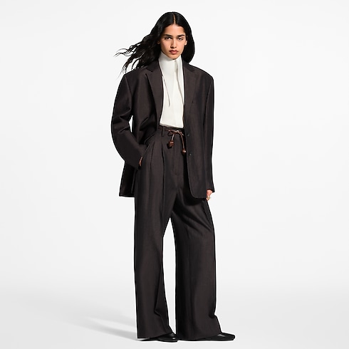 Ce pantalon aborde le tailoring avec une nonchalance maîtrisée. Réalisé dans un mélange léger de laine et de lin décliné dans une nuance de saison, il se distingue par une coupe ample élégante, structurée par des plis nets le long des jambes. La taille haute est complétée par la fine ceinture cordon en cuir de la saison et signée d’un patch Louis Vuitton Paris.