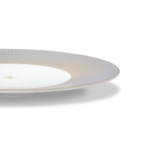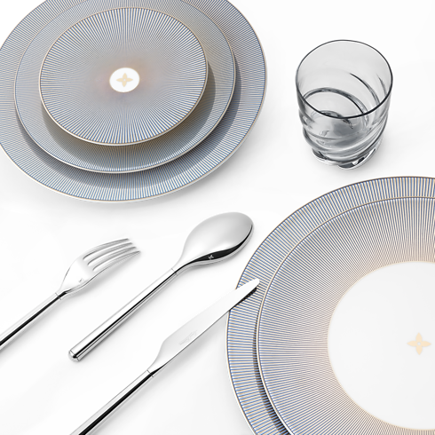 Créées pour la collection d’art de la table Louis Vuitton Dichroic, ces assiettes de service se distinguent par un design d’une rare originalité. La porcelaine de Limoges extra-blanche est sublimée de lignes ultrafines alternant l’or et deux nuances de bleu, formant un motif rayonnant à l’effet miroitant hypnotique. Parées d’un liseré doré et d’une fleur de Monogram au centre, ces assiettes témoignent d’un savoir-faire d’exception et insufflent une note de sophistication à toute table de fête.
