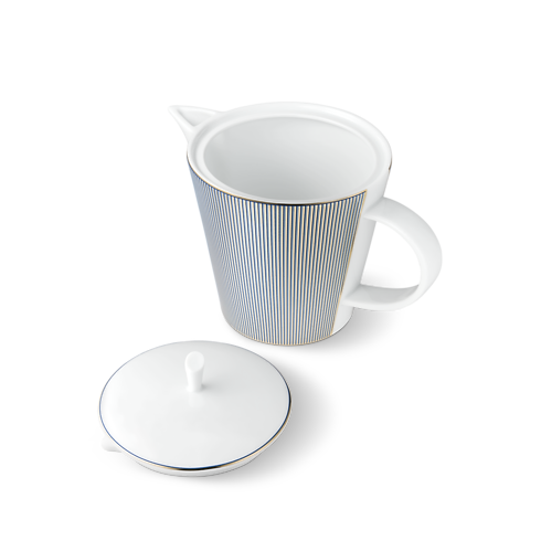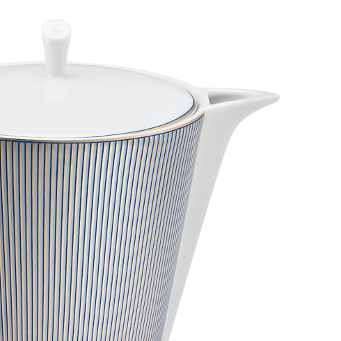 Confectionnée en porcelaine de Limoges, cette théière d’exception a été imaginée pour s'ajouter aux autres pièces de la collection de vaisselle Dichroic. Sa forme contemporaine et épurée est sublimée par un motif envoûtant de lignes bleues et or rayonnantes, rehaussé d’un bord doré des plus raffinés. Cette théière au style chic contemporain transforme le service et la dégustation du thé en une expérience d’une élégance unique.