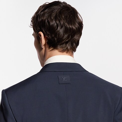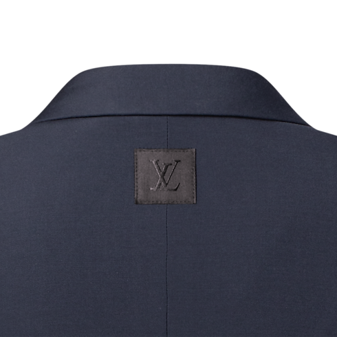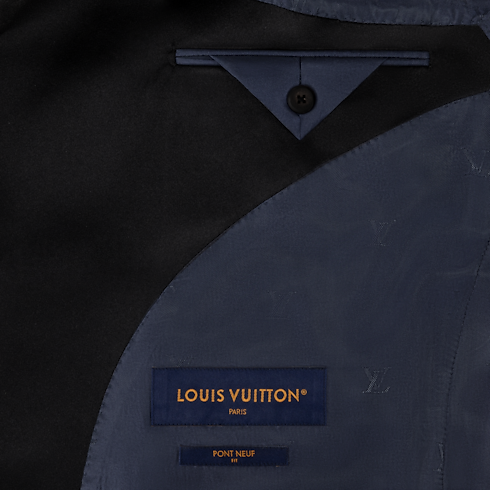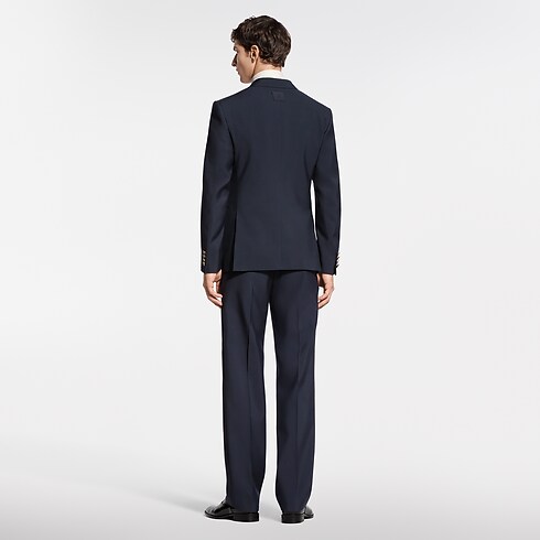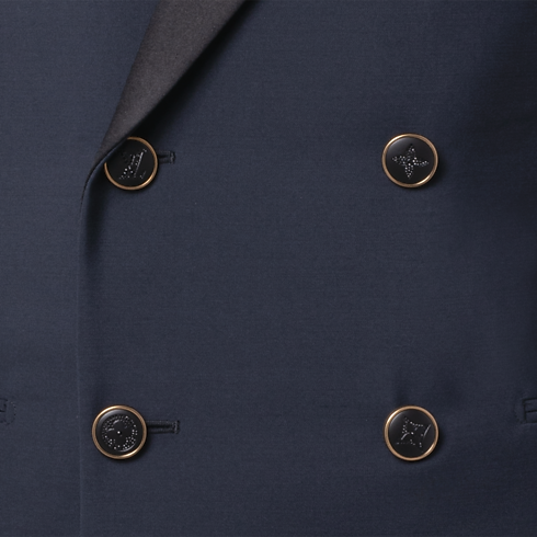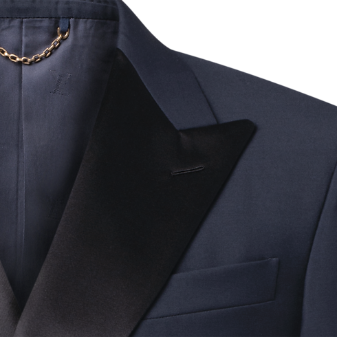 This sharply tailored tuxedo jacket is cut from elegant navy blue grain de poudre wool with a black satin peak lapel. Signature buttons with rhinestone accents in golden metal settings adorn the front, while a woven LV label discreetly signs the back. Matching pants make a poised and timeless evening set.