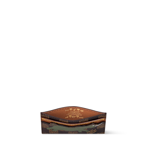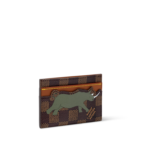 Ce porte-cartes double est confectionné en toile Damier Heritage et orné d’un motif de rhinocéros issue de la collection The Darjeeling Limited sur un côté. L’autre face présente les grandes lettres L.V. blanches emblématiques des sacs Louis Vuitton aperçus dans le film. Quatre fentes pour les cartes et une poche au centre lui confèrent une fonctionnalité remarquable.