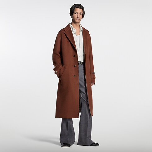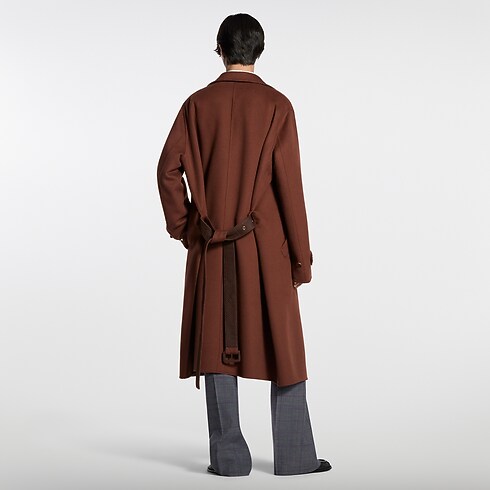 Issu du défilé Printemps-Été 2026, ce manteau ceinturé en laine et en soie incarne l’élégance désinvolte du thème dandy indien de la collection. Ce modèle fluide est confectionné dans un tissu double-face orné à l’intérieur d'un motif LV Maze graphique en jacquard inspiré des panneaux publicitaires indiens. Un patch en cuir marron, embossé d'un lettrage Louis Vuitton Paris apporte une finition chic à la manche gauche.