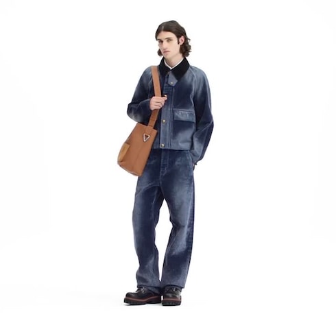 Cette veste bleu foncé est confectionnée en denim floqué au toucher velouté qui a été surteint et traité à la cire pour lui apporter une superbe patine vintage. Elle présente un col en velours côtelé inspiré du vestiaire de plein air britannique, ainsi que deux poches à rabat utilitaires estampillées du motif Monogram. Ce modèle s'associe au pantalon assorti pour donner une allure rustique à un look citadin.