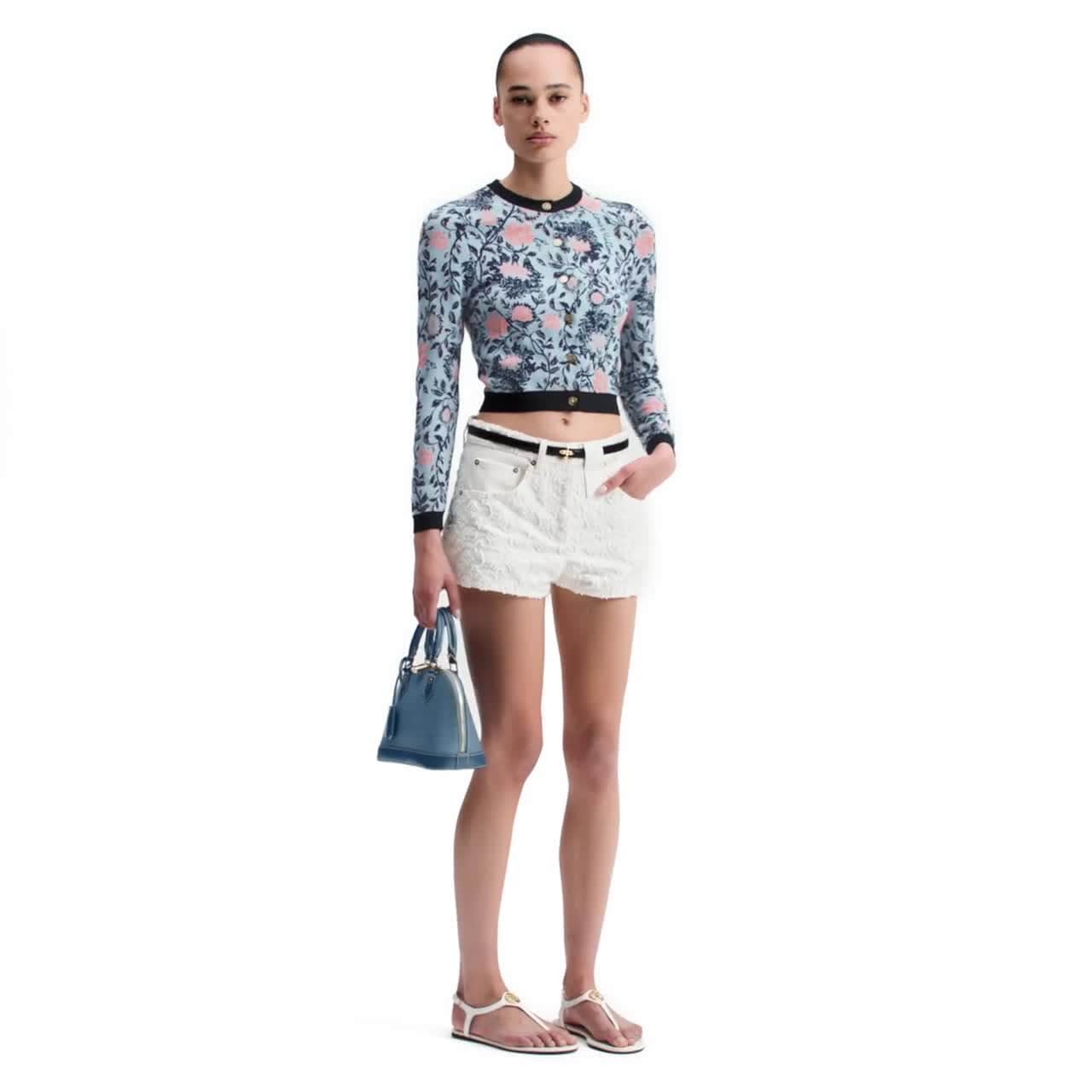Ce cardigan s'agrémente de détails romantiques et graphiques qui lui prêtent une allure décontractée dans l'air du temps. Réalisé en maille de soie et de coton mélangés, il s'habille du motif fleurs grimpantes de la saison. Des bords côtelés contrastés confèrent une esthétique sportive au col rond, aux poignets et à la taille, tandis que des boutons métalliques caractéristiques soulignent son élégance.