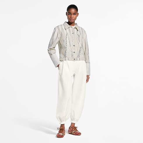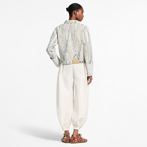 Cette veste en denim issue du défilé, offre une allure chic grâce à un motif floral évoquant les papiers peints graphiques traditionnels. Elle présente une coupe carrée, un col de chemise classique et une poche de poitrine, tandis que les manches se distinguent par des poignets larges à revers oversize, offrant un jeu de proportions subtil.