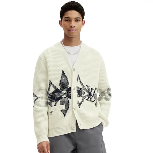 Ce cardigan d'hiver en laine s'agrémente d'un motif emblématique graphique orné d'une superposition de LV Initiales oversize et de fleurs de Monogram évoquant des flocons de neige sur le bas du torse et les manches. L'élégante maille intarsia se pare de coutures contrastées grises et bleues sur un fond blanc à larges côtes, créant un effet richement texturé. Un modèle idéal pour les soirées confortables après une journée sur les pistes de ski.