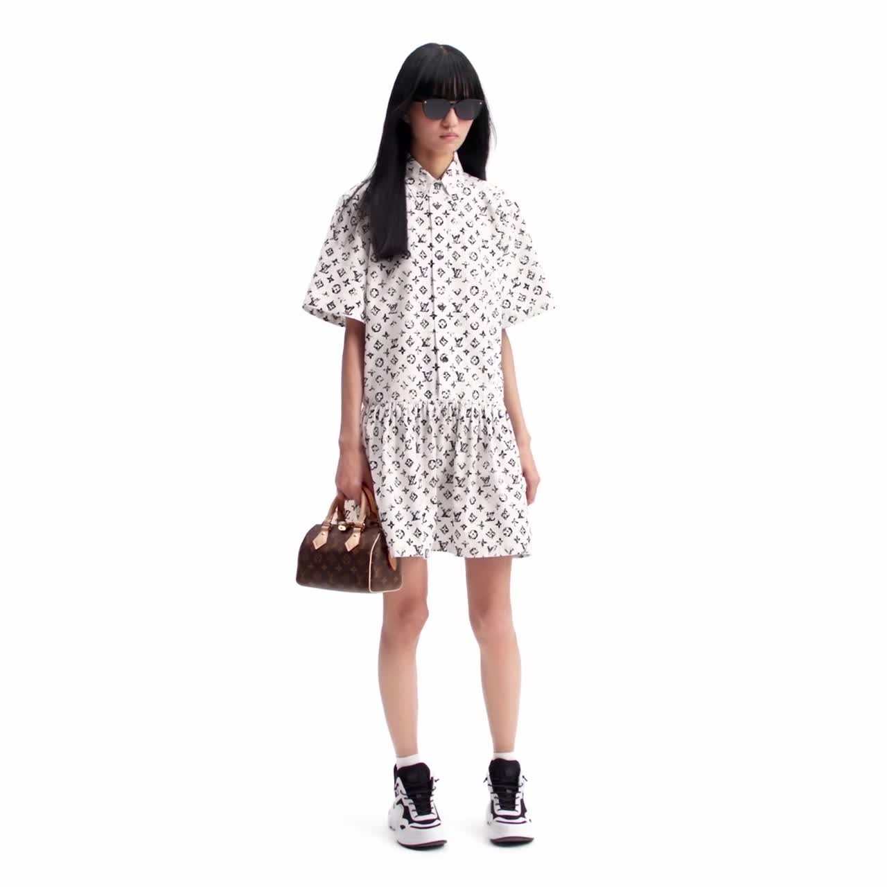 Confectionnée en popeline de coton, cette robe chemise à l'esprit audacieux et léger met en scène le motif Monogram graphique de la saison, inspiré du pop art. Le haut façon tailoring classique présente des manches courtes, un col chic et des boutons à l'avant, tandis que la jupe froncée autour des hanches ajoute un volume vaporeux à l'ensemble.