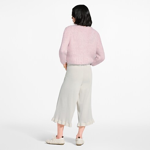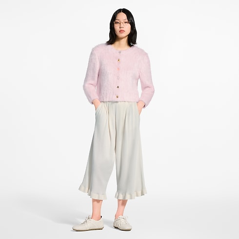 Issu de la collection défilé, ce cardigan chic et ludique se distingue par un somptueux mélange de soie et de mohair, sublimé par une finition brossée dans une nuance douce de saison. Sa forme carrée est agrémentée d’ourlets côtelés épais pour offrir une allure actuelle, tandis que des boutons-bijoux dépareillés viennent parfaire l’ensemble avec fantaisie.