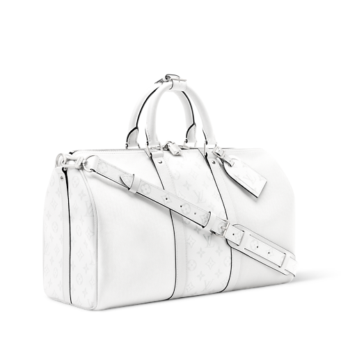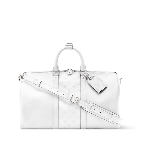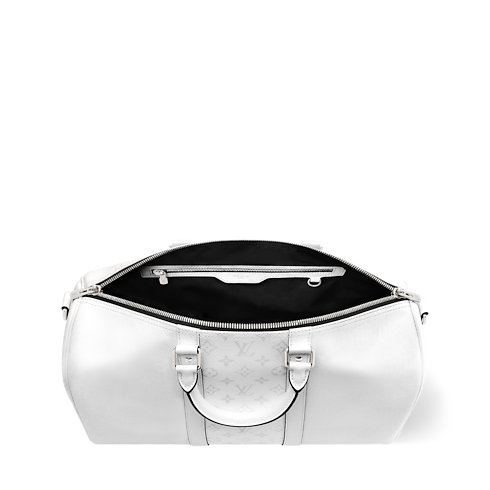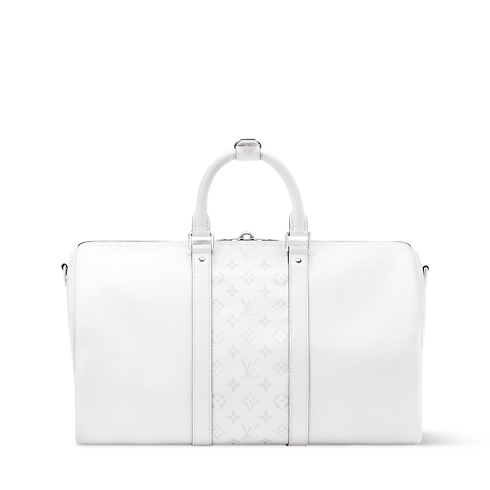 Ce sac Keepall Bandoulière 45 est confectionné en toile Monogram associée à du cuir Taïga assorti. La palette ton sur ton et les finitions métalliques argentées dynamisent ce sac de voyage fonctionnel. Deux poignées supérieures en cuir roulé et une bandoulière amovible et ajustable permettent différentes options de porté.