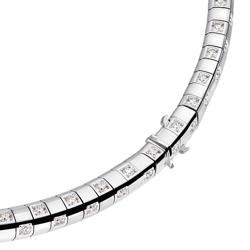 Le style graphique unisexe de ce collier large Le Damier de Louis Vuitton en fait un mariage unique entre talent artistique contemporain et tradition classique. Élaboré avec minutie en or blanc 18 karats poli à la main et incrusté de diamants étincelants, il évoque par son design le motif Damier emblématique de la Maison, un symbole intemporel d'infini créé par Louis et Georges-Louis Vuitton en 1888. Conçue pour être associée à d'autres bijoux, cette pièce exceptionnelle est destinée à être portée tous les jours sans jamais être retirée, à la façon d'une seconde peau.