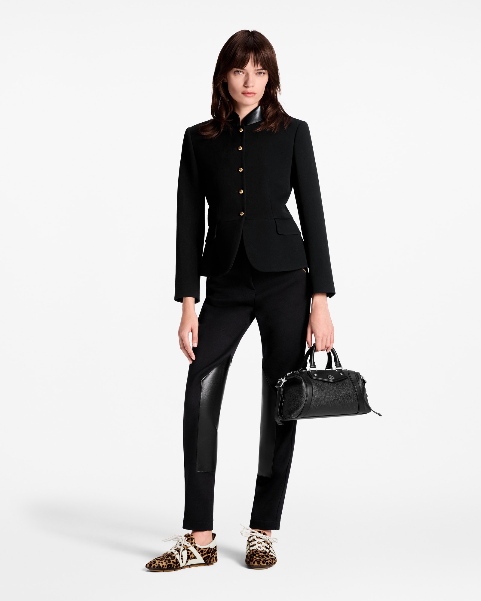 Ce pantalon revisite les codes équestres dans une version épurée et sophistiquée. Confectionné en laine double extensible, il épouse la silhouette avec souplesse et élégance. Les jambes se terminent par des empiècements en cuir d’agneau, tandis que les passants de ceinture en cuir assorti, ponctués de rivets dorés, ajoutent une note audacieuse. La fermeture à glissière dissimulée et les poches zippées accentuent le caractère chic et sportif de cette pièce.