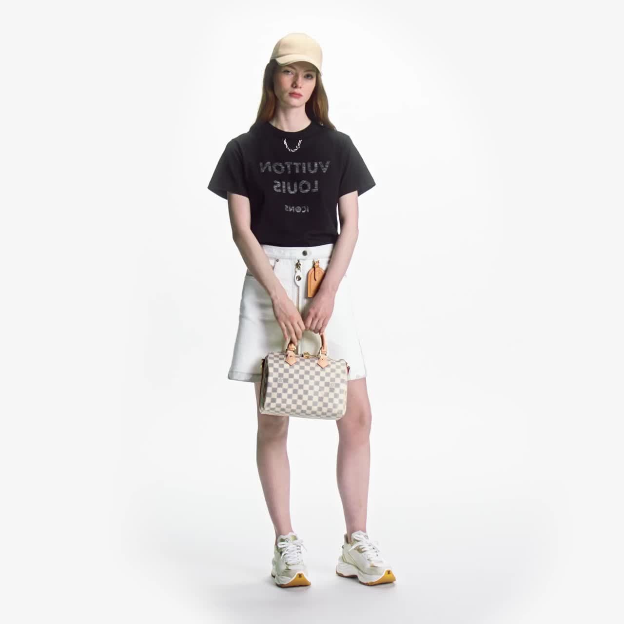 D'esprit ludique, ce tee-shirt imprimé revisite une forme classique avec une signature Louis Vuitton inversée. Imprimé sur un tissu en jersey de coton, le motif présente un effet chiné caractéristique. L'ornement chaîne emblématique de la Maison signe cette pièce.