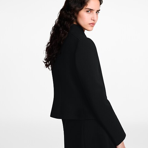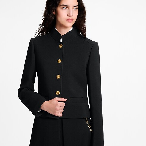 Cette veste d'officier est l'incarnation de l'esprit Nicolas Ghesquière. Réalisée en double crêpe de laine, elle présente une coupe ajustée élégante rehaussée d'un col montant et de deux poches sur les côtés. Des boutons dorés embossés LV ajoutent une note raffinée sur la fermeture à l'avant, tandis que l'intérieur révèle une doublure en soie Monogram classique.