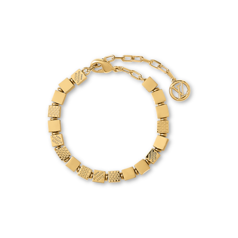 Finement réalisé en métal doré, le bracelet LV Cube s’inspire à la fois du motif Damier emblématique et du jeu de réflexion Pateki, imaginé par Gaston Vuitton en 1932. Ses cubes délicatement articulés sont gravés de rayures évoquant la toile Damier, ainsi que de la signature Louis Vuitton Paris, apportant une touche distinctive de la Maison. Cette pièce a été pensée pour insuffler une note élégante et ludique à une tenue.
