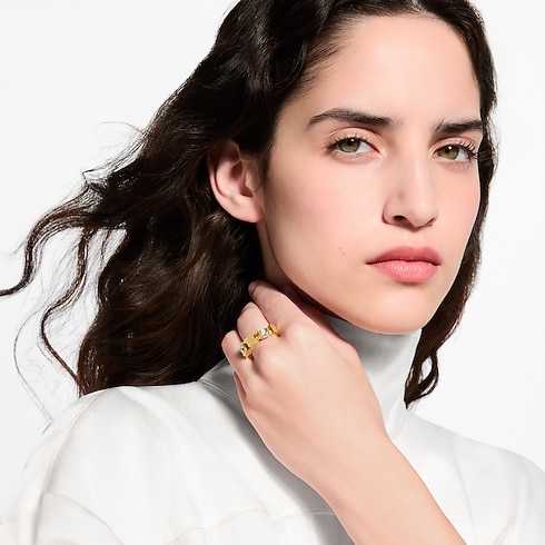 Les formes angulaires saisissantes de cette bague LV Cube s’inspirent du Pateki, un jeu de réflexion imaginé par Gaston Vuitton en 1932. Son anneau en métal doré accueille une composition de cubes évoquant la toile Damier historique, gravés de fines rayures et de la signature Louis Vuitton Paris. Des strass éclatants viennent ponctuer l’ensemble d’une note lumineuse et raffinée.