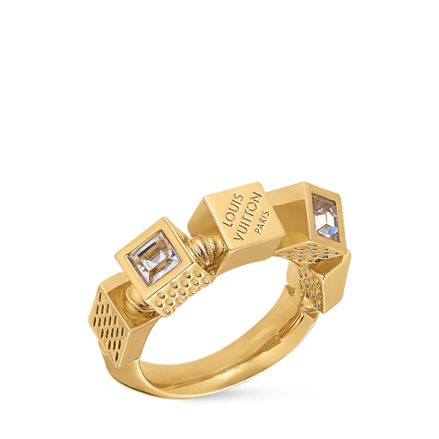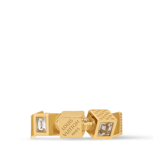 Les formes angulaires saisissantes de cette bague LV Cube s’inspirent du Pateki, un jeu de réflexion imaginé par Gaston Vuitton en 1932. Son anneau en métal doré accueille une composition de cubes évoquant la toile Damier historique, gravés de fines rayures et de la signature Louis Vuitton Paris. Des strass éclatants viennent ponctuer l’ensemble d’une note lumineuse et raffinée.