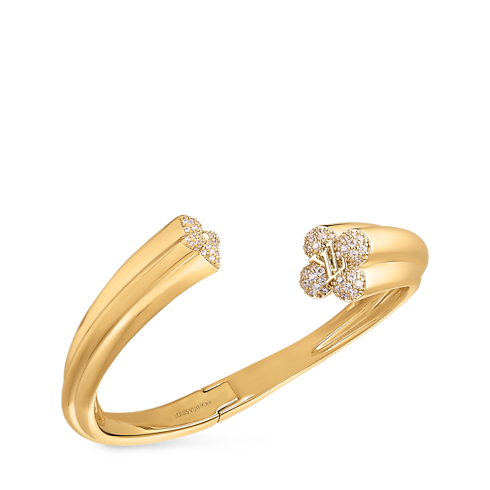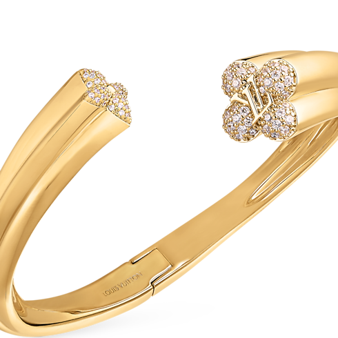Confectionné en métal doré éclatant, ce bracelet manchette illustre l'engagement de la Maison envers l’innovation et l'excellence. Son design géométrique et sculptural évoque la trajectoire d’une comète dans le ciel nocturne. Ponctué de fleurs de Monogram pavées de strass à chaque extrémité, ce bijou résolument contemporain se distingue par son élégance avant-gardiste.