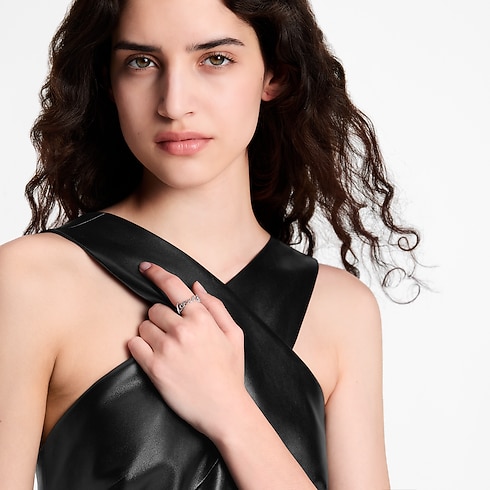 The unique design of the LV Script ring was inspired by the bold, sleek House signature spotlighted in the Spring-Summer 2025 runway show. Its gleaming palladium-toned metal band spells out the name Louis Vuitton in a smooth, flowing script style. On-trend and elegant, this eye-catching ring adapts easily to casual or more formal looks.
