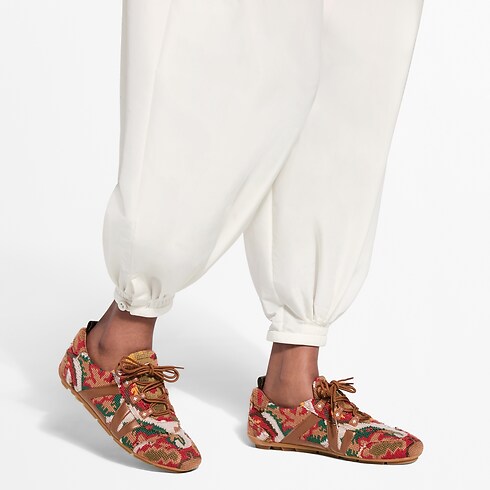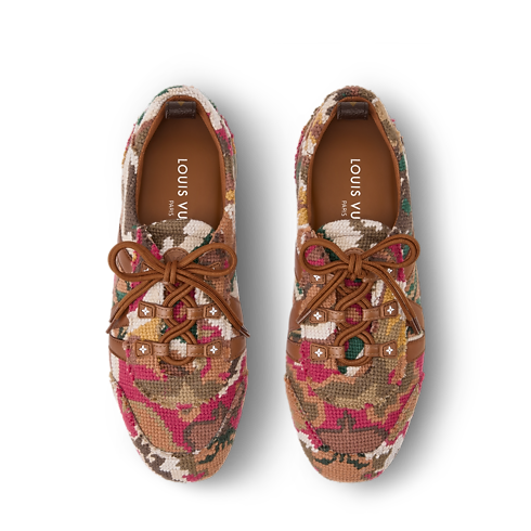 Aperçue lors du défilé Printemps-Été 2026, cette édition de la sneaker LV Sneakerina se décline dans une version façon tapisserie, s’inspirant à la fois des tapis orientaux et de la broderie française du 19e siècle. Le motif à l’esprit vintage évoque les fleurs de Monogram emblématiques de la Maison, tandis que le LV sur le côté est réalisé en cuir de veau. Une semelle extérieure en gomme souple complète ce soulier d’exception.