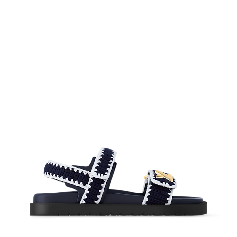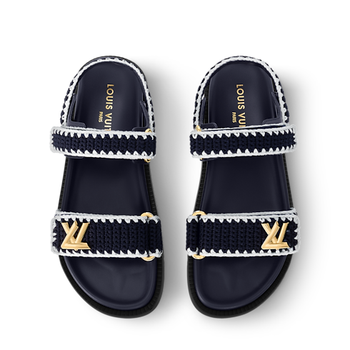 Cette sandale confort LV Sunset se décline cette saison en coton crocheté bicolore qui lui confère un aspect artisanal et raffiné. Ce modèle décontracté se distingue par ses deux brides, dont l'une est signée d'un accessoire LV Twist doré. Il se dote d'une semelle intérieure anatomique matelassée et d'une semelle extérieure en gomme légère pour assurer un confort optimal.