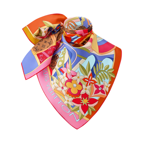 Innovation meets imagination in the artistic pattern of the LV Wonderland square. Printed on sumptuous silk, it depicts a playful, futuristic landscape of blooming Monogram Flowers combined with iconic Louis Vuitton trunks and bags, plus a House signature in dynamic 3D-effect lettering. With its radiant colors and eye-catching contrasts, this versatile accessory makes a bold creative statement.
