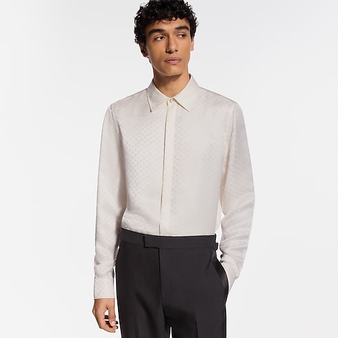 This white silk shirt is a sophisticated choice for evenings. It is embellished with a jacquard Mini Monogram motif, whose tone-on-tone play of matte and smooth textures highlights the fabric’s fluid drape and natural luster. This versatile shirt can be styled with any evening set or as a sophisticated standalone piece.