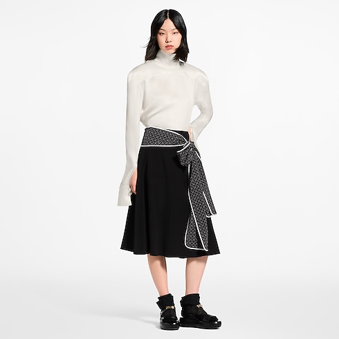 Confectionnée en crêpe de Chine en soie dans une coupe fluide longueur genou, cette jupe séduit par son élégance raffinée. La taille est sublimée par un foulard en twill de soie noué de façon décontractée, orné d’un motif Monogram miniature décliné en impression bicolore pour une touche graphique emblématique. Elle se complète, sur le côté, d'une fermeture éclair invisible assurant une finition épurée.