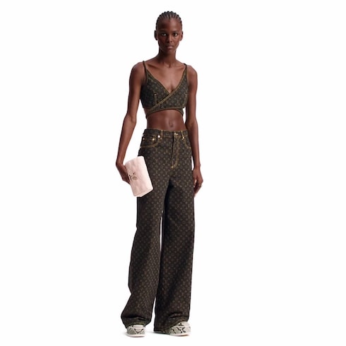 Revisité pour la saison, ce jean essentiel s'habille du motif Monogram imprimé au laser qui fait référence aux malles de voyage historiques de la Maison. Ce modèle à la coupe droite intemporelle est rehaussé de surpiqûres jaunes contrastées qui soulignent son esprit structuré et vintage, tandis que les boucles discrètes façon carpenter sur les poches arrière évoquent le style utilitaire.