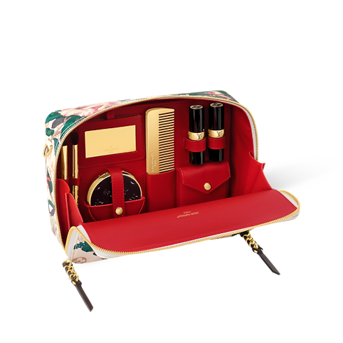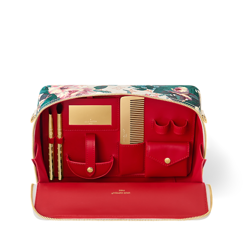 Issu de la collection Monogram Eden, ce sac Nécessaire est un modèle élégant et astucieux. Confectionné en toile Monogram Dune, il est magnifiquement orné d'un motif floral de couleur vive. Il est souligné de garnitures en cuir de vache et dévoile à l'intérieur une doublure rouge remarquable, ainsi que sept poches permettant de ranger un smartphone et des produits cosmétiques. Il comprend deux pinceaux, un peigne et un miroir, et offre la possibilité d’y ranger un fard à paupières et deux rouges à lèvres. Les finitions métalliques dorées lui confèrent une allure raffinée.