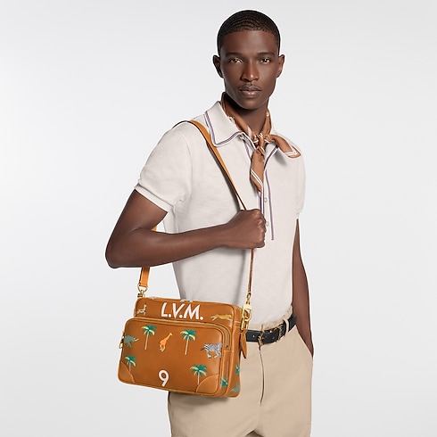Ce sac Nil GM s’inscrit dans la collection LV x The Darjeeling Limited, qui célèbre le film culte et les sacs Louis Vuitton qui y apparaissent, avec une composition peuplée d’animaux sauvages en pleine course. Confectionné en cuir de veau naturellement bruni, il arbore une patine sfumato évoquant le charme des pièces vintage. Ce modèle doté de deux compartiments zippés offrant un rangement sécurisé peut se porter à la main ou en bandoulière.