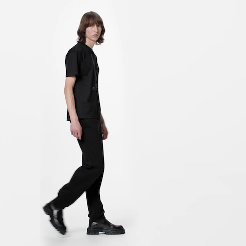 Ce pantalon sportif en molleton de coton brossé revêt un des coloris phares de la saison, nuancé par un cordon blanc contrasté à la taille. Une broderie Louis Vuitton blanche au-dessus de la poche avant gauche et une épingle assortie étayent la pièce.