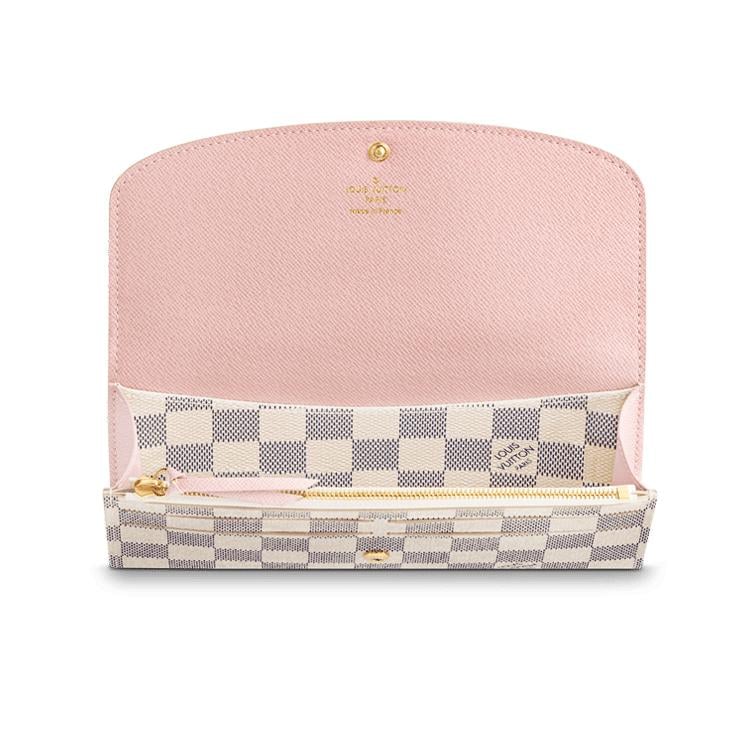 Simple et résolument élégant, ce portefeuille Émilie se décline en toile Damier Azur doublée de cuir de vache grainé. Son rabat dissimule un compartiment intérieur spacieux, une poche à fermeture à glissière pour la monnaie et quatre fentes pour les cartes. Ce modèle fin, qui convient à tous les types de sacs, se porte également en pochette.
