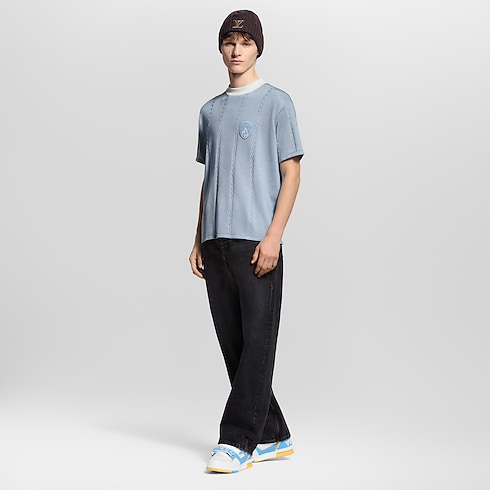 This pale blue short-sleeved crewneck is crafted from a lustrous blend of organic cotton and silk with tone-on-tone cable-knit stripes. It features a sophisticated embroidered LV League patch on the chest inspired by American university crests. A contrasting white intarsia Vuitton signature on the back and a ribbed white collar add a sporty twist to this sophisticated piece.