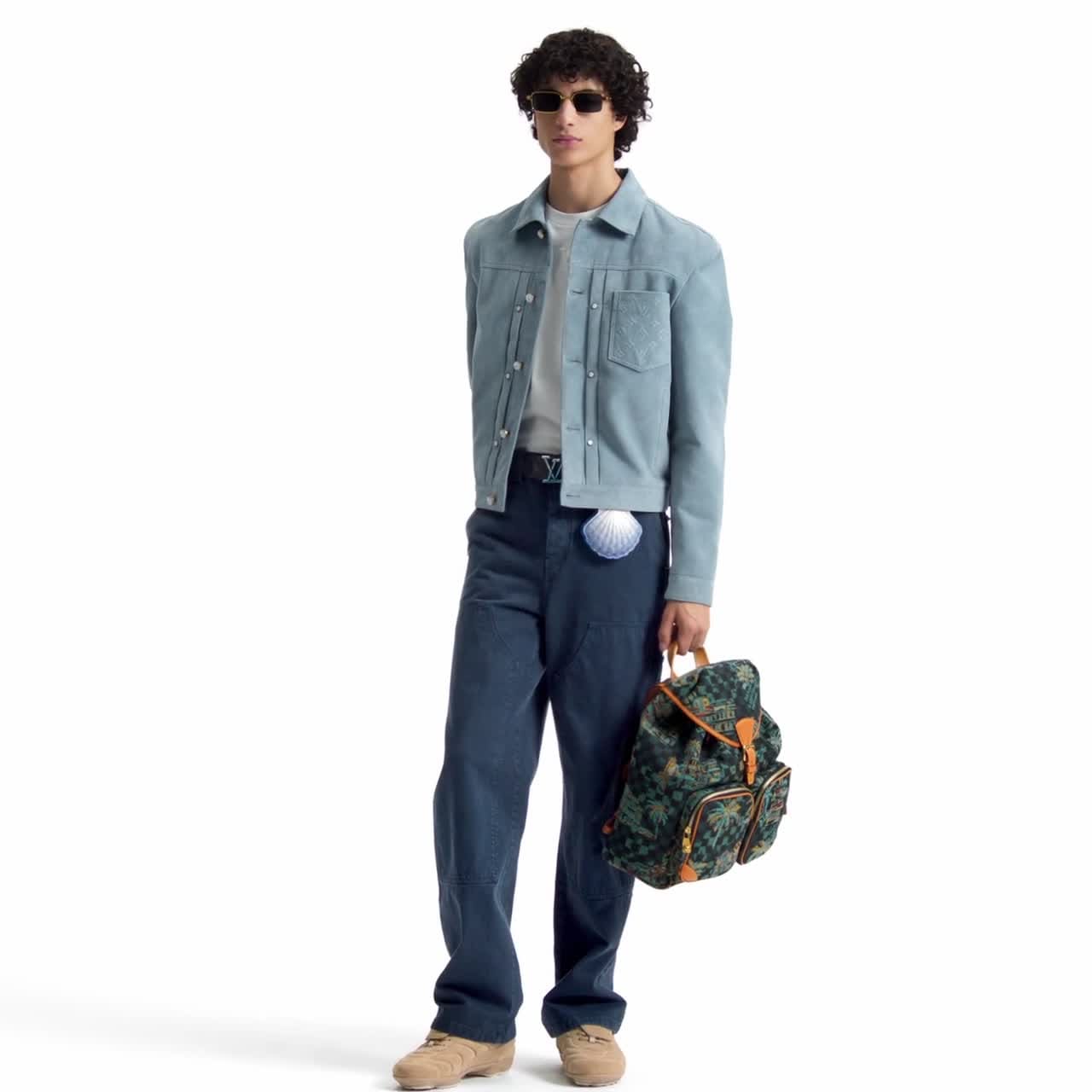 Déclinaison chic de la veste en denim Type II, cette veste en cuir velours dans les tons bleus fumés réinterprète avec raffinement les looks quotidiens. Le cuir velours souple est rehaussé d'une poche plaquée ornée du motif Monogram sur la poitrine, tandis qu'un patch en cuir « Marque L. Vuitton Déposée » signe le dos. Des boutons et des rivets effet perle apportent une note finale d’inspiration dandy.