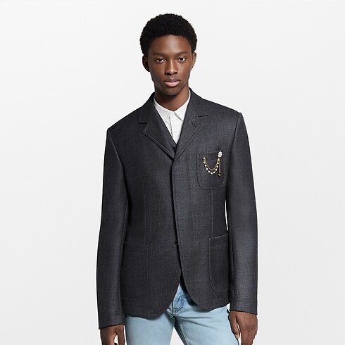 Cette veste à boutonnage simple inspirée de la tradition du tailoring anglais est confectionnée en sergé de laine raffiné dans une nuance gris foncé intemporelle. Des détails workwear discrets, tels que le revers à crans haut et la patte de boutonnage dissimulée, apportent une note contemporaine à l'ensemble, tandis qu'une broche amovible façon bijou renforce le côté dandy sophistiqué. Associé au gilet et au pantalon assortis, ce modèle compose un costume trois-pièces résolument élégant.