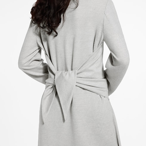 Présenté lors du défilé, ce manteau réinvente le look désinvolte du peignoir en y ajoutant des touches raffinées. Confectionné en laine mélangée feutrée et duveteuse, il possède une silhouette longue qui tombe gracieusement jusqu'aux chevilles. La finition structurée du col à revers cranté et les boutons géométriques minimalistes sont compensés par les liens noués décontractés au dos.