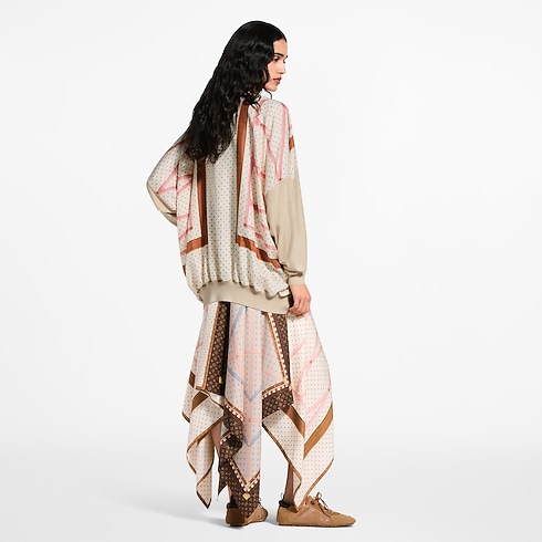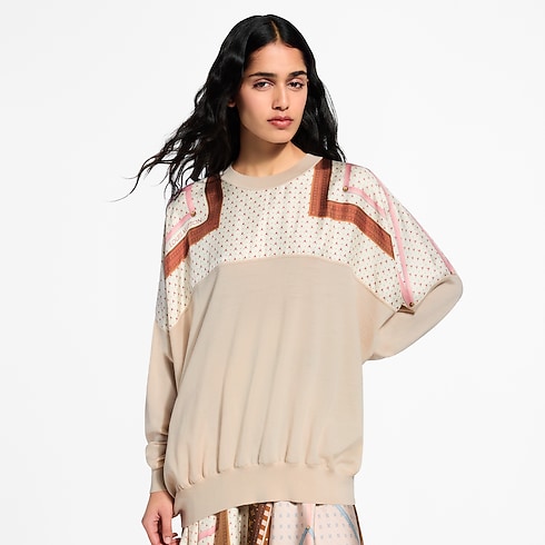 Ce pull doté d'une coupe ample et décontractée est confectionné en maille de laine fine et orné d'ourlets côtelés confortables qui lui confèrent un style raffiné au quotidien. Le dos et les épaules sont rehaussés de twill de soie fluide agrémenté de l'imprimé emblématique de cette saison représentant l'intérieur d'une malle d'archives Louis Vuitton, en hommage à la tradition du voyage de la Maison.