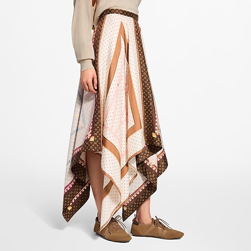 Cette jupe spectaculaire de la collection défilé est confectionnée en twill de soie fluide avec une longueur genou sublimée par une ligne d'ourlet graphique façon mouchoir, apportant volume et mouvement. Elle est ornée d’un imprimé représentant l’intérieur des malles historiques de la Maison et rehaussée de bordures Monogram pour une signature emblématique. Une fermeture éclair invisible complète le dos.