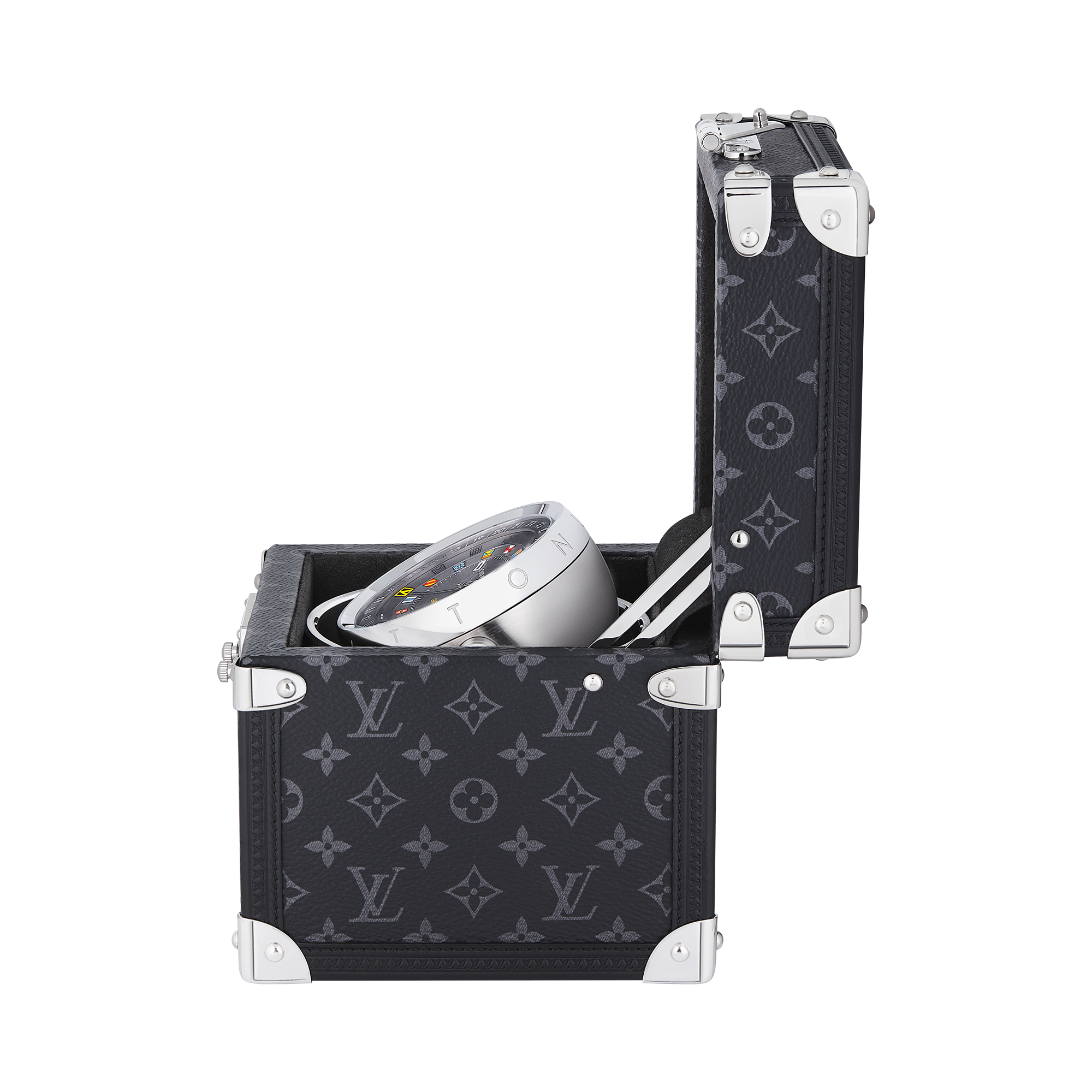 Cadeau unique, cette malle pendulette luxueuse associe une fonction traditionnelle à l'art du voyage légendaire de Louis Vuitton. Lorsque son couvercle s'ouvre, la malle emblématique de la Maison révèle le plus grand des trésors : le temps. La malle est habillée de la toile intemporelle Monogram Éclipse, mélange de sobriété et de sophistication. À l'intérieur, le cadran concave à double fuseau horaire donne une impression de profondeur avec un affichage au format 24 heures et un indicateur GMT qui permettent de lire l'heure locale et celle du domicile d'un seul coup d’œil. Douze drapeaux colorés rappellent les malles de voyage d'antan.
