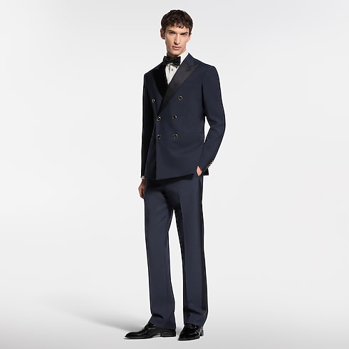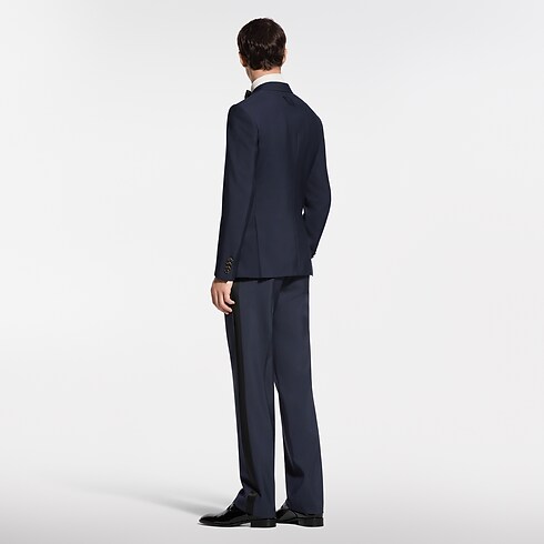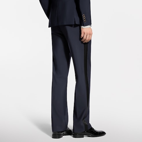 These sharply tailored tuxedo pants have a flattering cigarette fit. They are cut from elegant navy blue grain de poudre wool with black satin bands on the outside of each leg and satin piped rear pockets. A woven LV label discreetly signs the back of the waist. A matching double-breasted jacket makes a poised and timeless evening set.