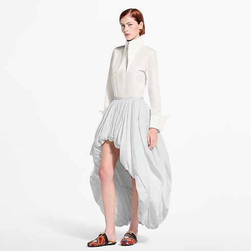 Cette chemise joue sur les volumes et l'effet spectaculaire. Confectionnée en popeline de coton selon une coupe cintrée, elle présente une fermeture dissimulée à l'avant qui lui prête une allure épurée. Un col pointu exagéré et des poignets oversize accentuent l'élégance remarquable du modèle, tandis que des boutons métalliques LV Cube agrémentent l'ensemble d'une note graphique actuelle.