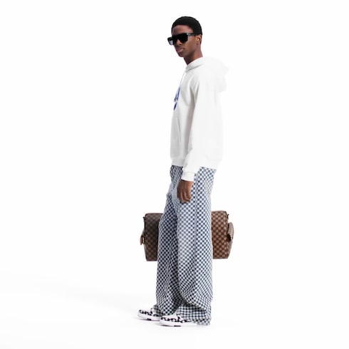 Celana panjang jeans dari koleksi Fall-Winter 2025 ini hadir dalam potongan kaki yang lebar dan berhiaskan corak Mini Damier di seluruh permukaannya. Motif yang dibordir dengan benang berwarna putih kontras menyajikan finishing bertekstur halus di atas bahan denim organik dengan efek washed. Detail rivet beraksen mutiara menghiasi bagian saku, sementara nubuck Mini Damier jacqueron di bagian belakang menampilkan nuansa khas musim panas.