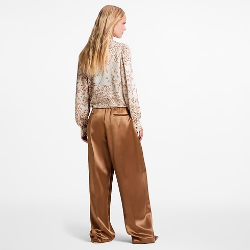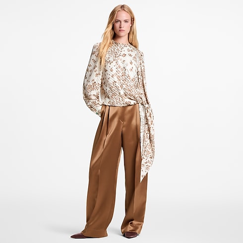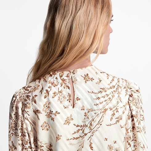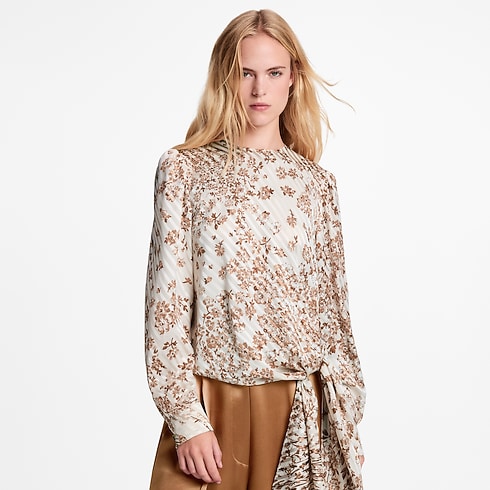 Blus ini menghadirkan tampilan chic dan modern dalam balutan bahan silk twill yang ringan dengan motif jacquard romantis berupa corak garis dan bunga. Lengan panjangnya dirancang dengan kerutan di sekitar bahu untuk menonjolkan kesan fluid, sementara bagian pinggul kiri diberi finishing simpul longgar yang ringan dan menjuntai anggun ke samping. Busana ini dilengkapi detail keyhole yang elegan di bagian belakang.